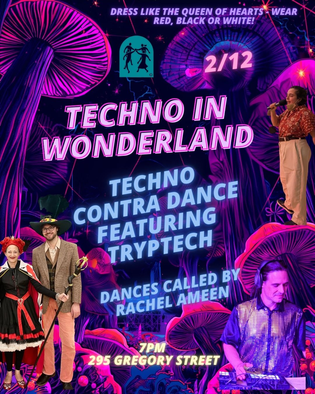 This all-ages, multi-generational Techno Contra features traditional contra dancing set to live, high-energy electronic-infused music. Dances are called by Rachel Ameen, with Tryptech creating a one-of-a-kind sound using fiddle, keyboard, and a synth-driven rhythm setup with drums – a unique blend that’s both deeply groovy and unmistakably contra.