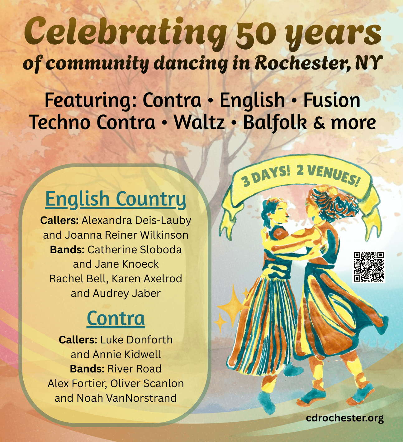 Except for the global COVID pandemic, we have danced contras every Thursday in Rochester, NY since 1976, and English country dances for many of those Sundays. In our 50th year, it’s time for a celebration of the great times we’ve had dancing and the dear friendships we have formed, as well as to look forward to creating more joyous dancing and new friendships! We’re planning a huge celebration for the last weekend of November.